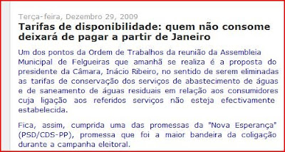 Pelo quadro anexo, pude verificar que Felgueiras é o município que aplica a taxa de disponibilidade de serviço mais baixa, comparando com todos os municípios aqui vizinhos, nomeadamente com Penafiel, Paredes, Lousada, Castelo de Paiva, Amarante, Guimarães e Fafe.